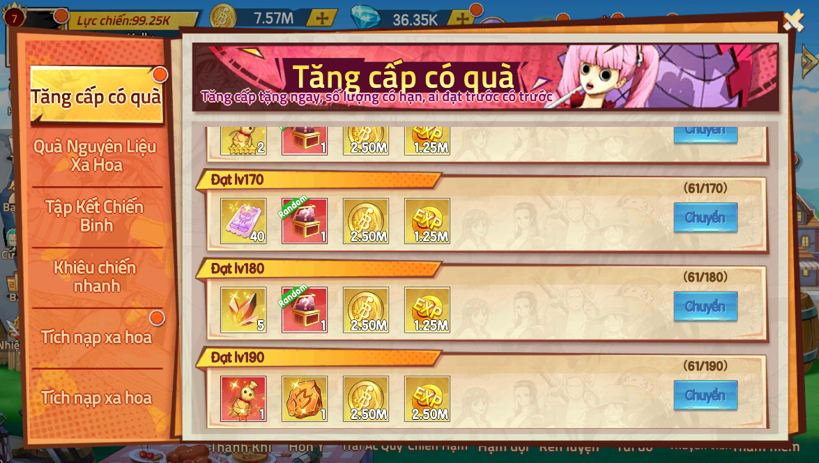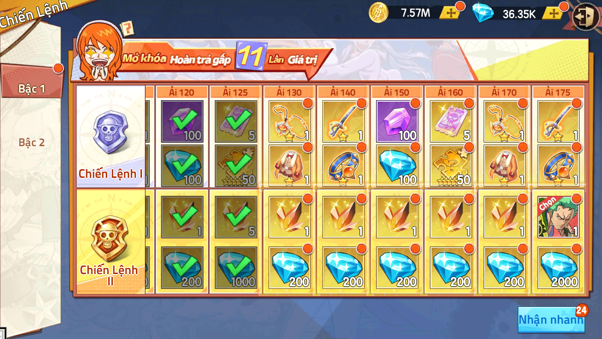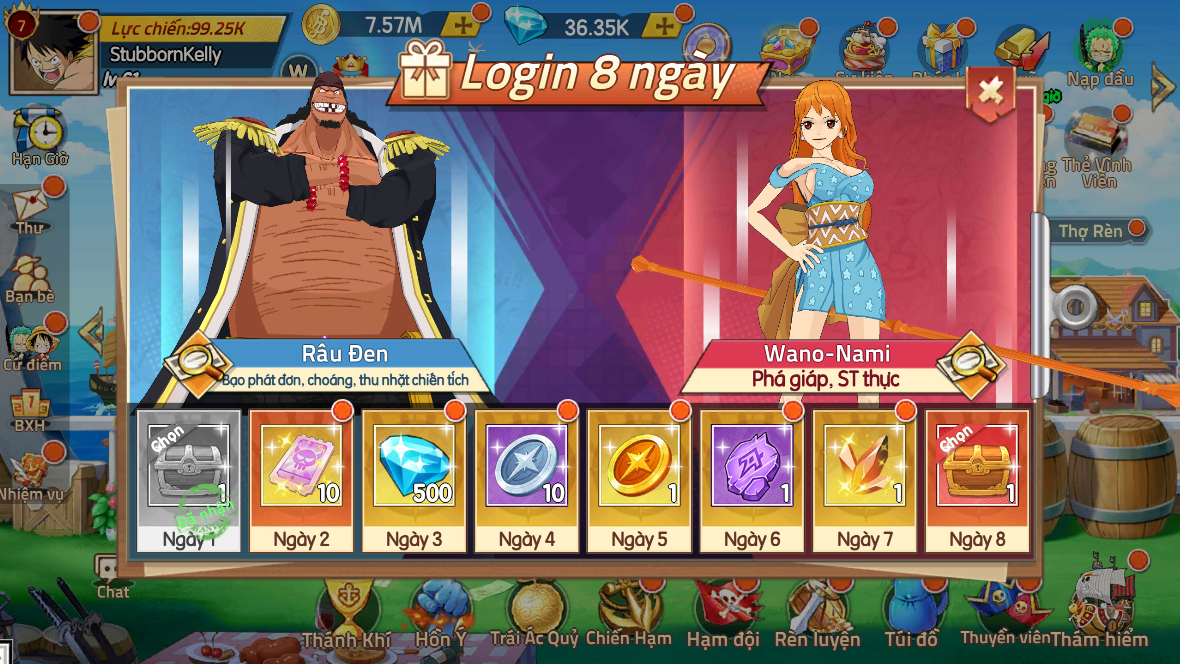 Đến với Phúc Lợi đầu tiên là Đăng Nhập 8 ngày Tân Thủ. Các Đồng Đội sẽ nhận được các phần quà giá trị như Rương Chọn Đồng Đội Tinh Anh, Kim Cương, Thẻ Chiêu Mộ Cao Cấp, Rương Sách Haki,…