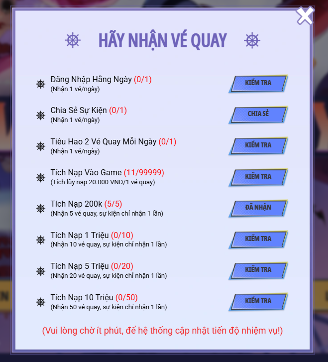 Các Nhiệm Vụ Mỗi Ngày sẽ được làm mới vào lúc 0h00 mỗi ngày trong thời gian diễn ra sự kiện! (Từ 0h00 ngày 20/03/2026 đến 23h59 Ngày 30/03/2026) (Đối với nhiệm vụ tích lũy nạp, Thuyền Trưởng cần chờ 5~10' để hệ thống cập nhật tích lũy nạp) |