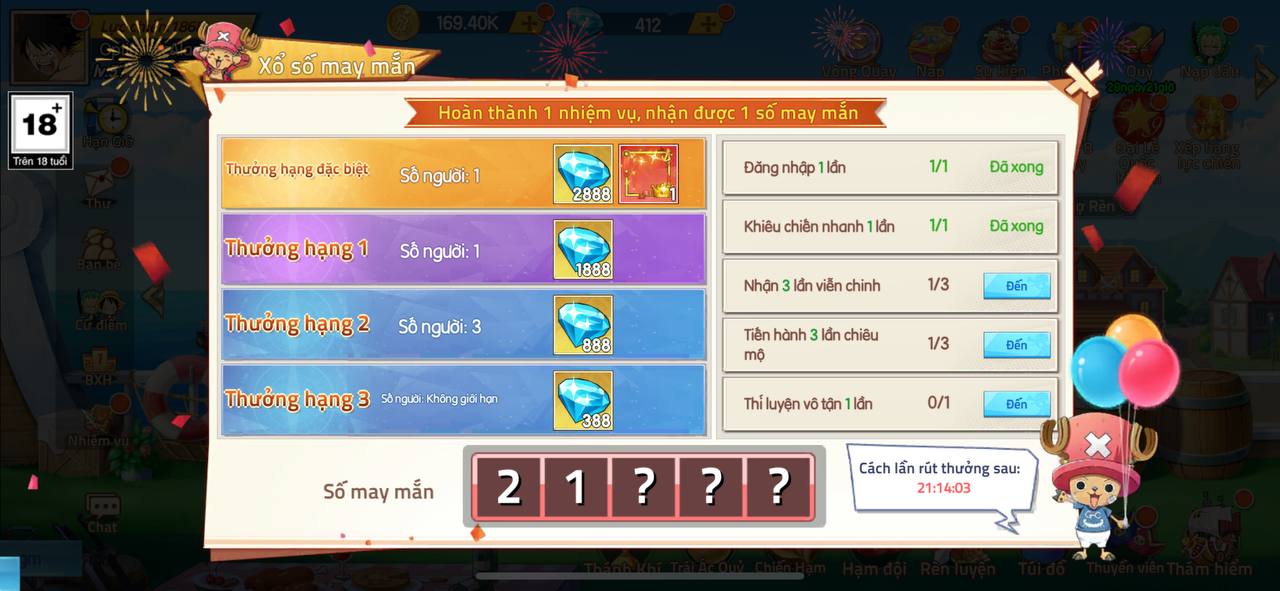 - Mỗi ngày tham gia sự kiện làm nhiệm vụ, cứ hoàn thành 1 nhiệm vụ sẽ nhận ngẫu nhiên 1 con số may mắn, tổng có 5 số may mắn, cần tổ hợp thành dãy số rút thưởng, nếu ng chơi chưa thu thập đủ con số sẽ không thể tham gia rút thưởng.